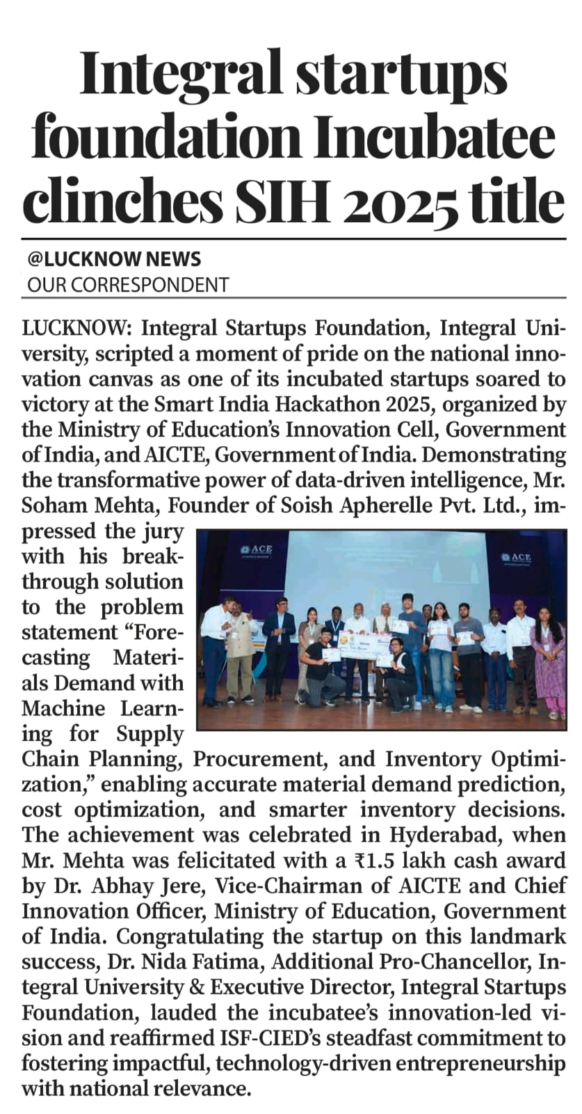 Integral Startups Foundation Incubatee Triumphs at Smart India Hackathon 2025